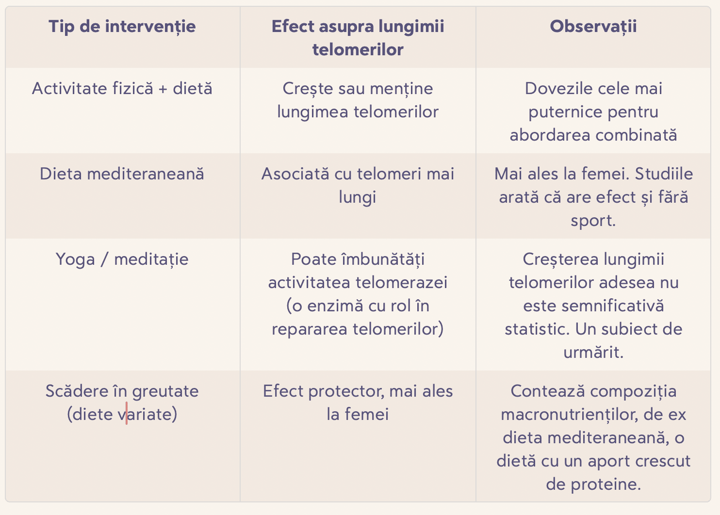 Există mai multe tipuri de intervenții care pot ajuta telomerii. În general țin de stil de viață, care reduce inflamația și a stresul oxidativ, la nivel celular. Studiile sunt încă destul de limitate și diferite în abordare, dar cu siguranță vom vedea din ce în ce mai multe intervenții riguroase, care să studieze beneficiul pe termen lung.